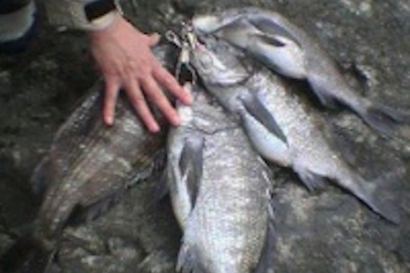 午後4時頃までは餌取りが多く全くダメでしたが、4時頃から餌が残るようになり、まず、友人にアタリましたが、ハリス切れ。