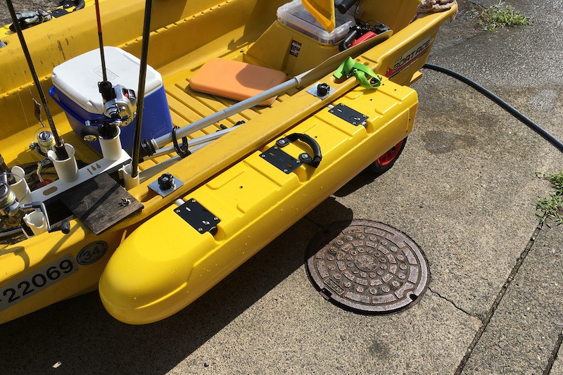船体とフロートの間の隙間はできるだけ狭くしましたので、ここから海水が上がって来ることは少なく、上がっても持ち手の返しがあるので船内には入って来ません。