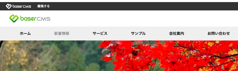ヘッダメニューの変更 BaserCMS 2022.02.01 当初のメニューはこれです。 初期データのうち不要なものをとりあえず非公開にしておきます。 コンテンツ一覧から変更できます。 サービス、サンプル、会社案内を非公開にしました。 削除してもいいのですが、今後使うことがあるかもしれないので非公開とします。 以下のようになります。
