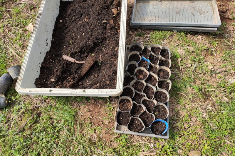 培養土を買ってきて、ポットにその土を入れ、種の袋に説明書きがありましたので、1つのポットに2~3粒づつ播いて少し覆土(少し深かったかも)をし、たっぷり水をやって、パイプハウスに入れて、上から新聞紙を被せておきました。